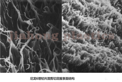 三、剪切屈服機理。尼龍6增韌共混物在拉伸或沖擊斷裂的瞬間,斷面產(chǎn)生高溫,達到基體的玻璃化溫度Tg以上,基體斷裂型變時產(chǎn)生塑性流動,基體剪切屈服耗散了大量的沖擊能,韌性大幅提高。
