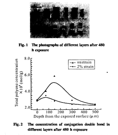 (2)次表層:在該層中,以脫HC1生成共軛雙鍵反應(yīng)為主。該區(qū)域在光老化過程中會(huì)生成大量的共軛雙鍵,由紫外分析得到,雖然兩組樣總共軛雙鍵數(shù)量基本一致,但受應(yīng)力時(shí)共軛雙鍵層為150 μm-300μm;無應(yīng)力時(shí)共軛雙鍵層為75 μm~500 μm。表明在次表層,應(yīng)力使試樣脫HC1反應(yīng)更集中發(fā)生在較窄的區(qū)域。