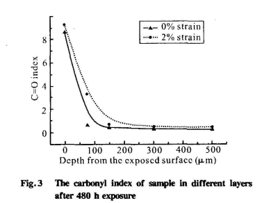 從各層羰基指數(shù)的變化趨勢(shì)(Fig.3)可知,試樣表層羰基指數(shù)大,且隨著厚度的增加,羰基指數(shù)大幅度降低,表明:氧化反應(yīng)主要發(fā)生在試樣的表面層。